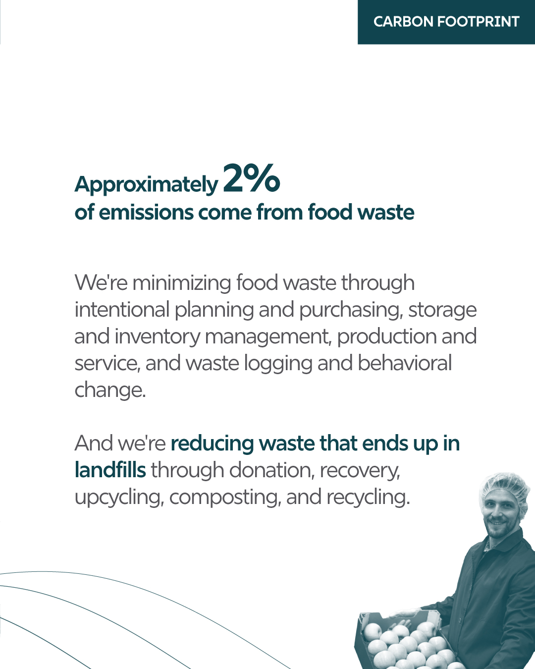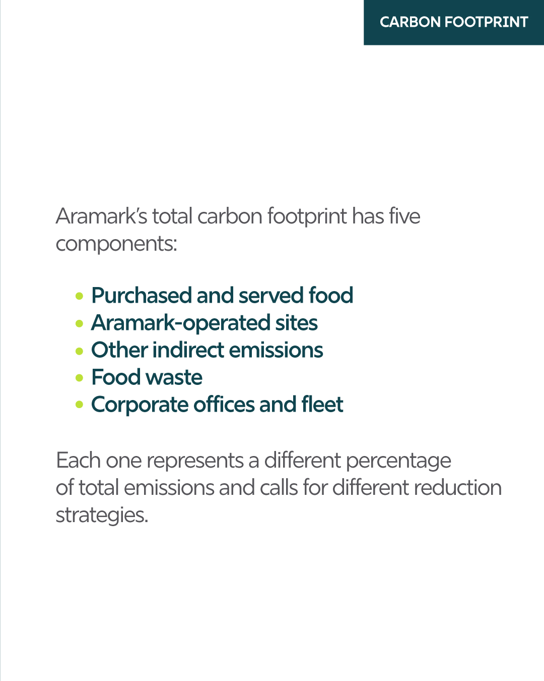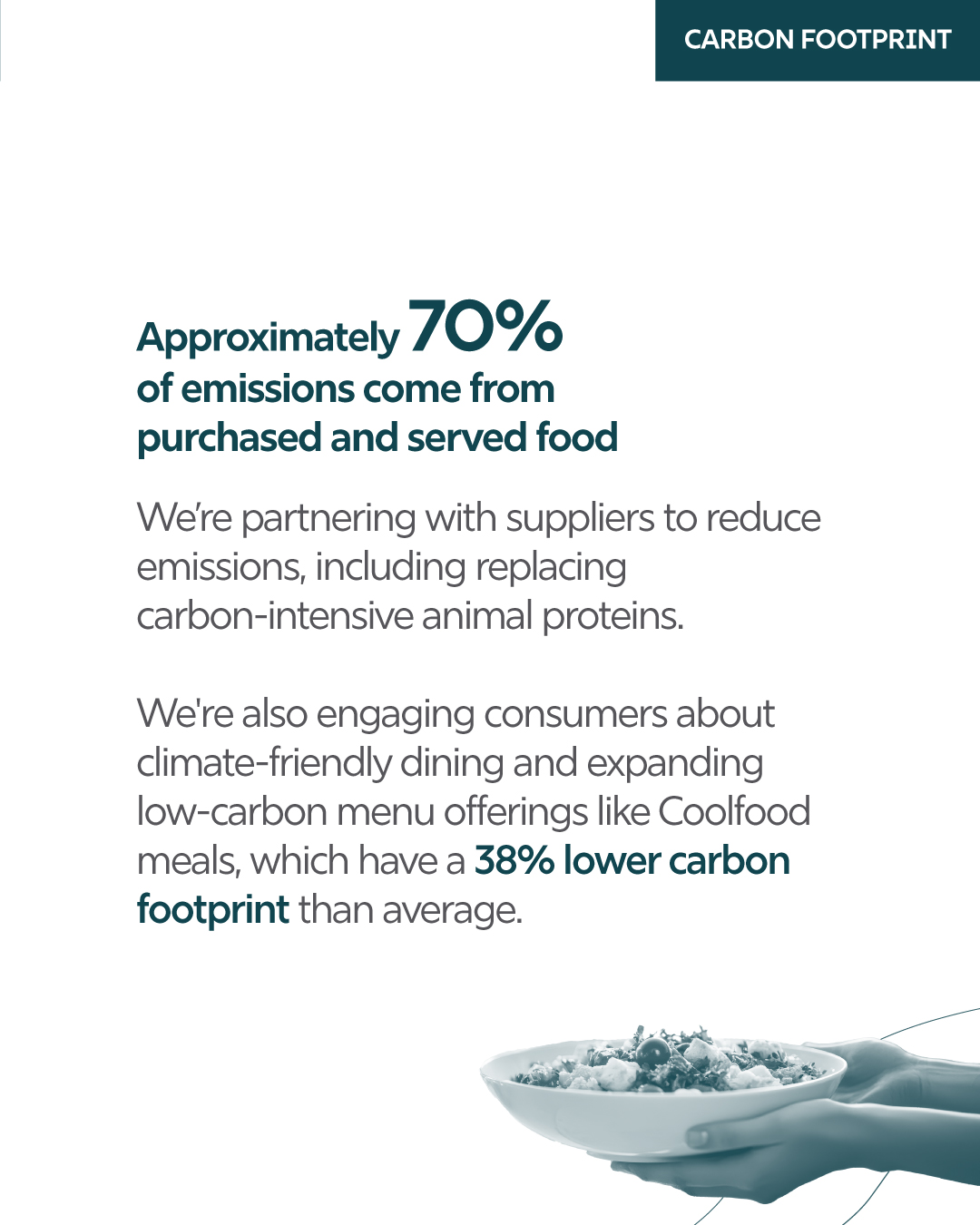 For most food service companies, food represents their largest emissions source, placing food at the center of their climate strategies. They continually develop and offer more sustainable menu items while partnering with suppliers to reduce the carbon intensity of food from production to consumption.
